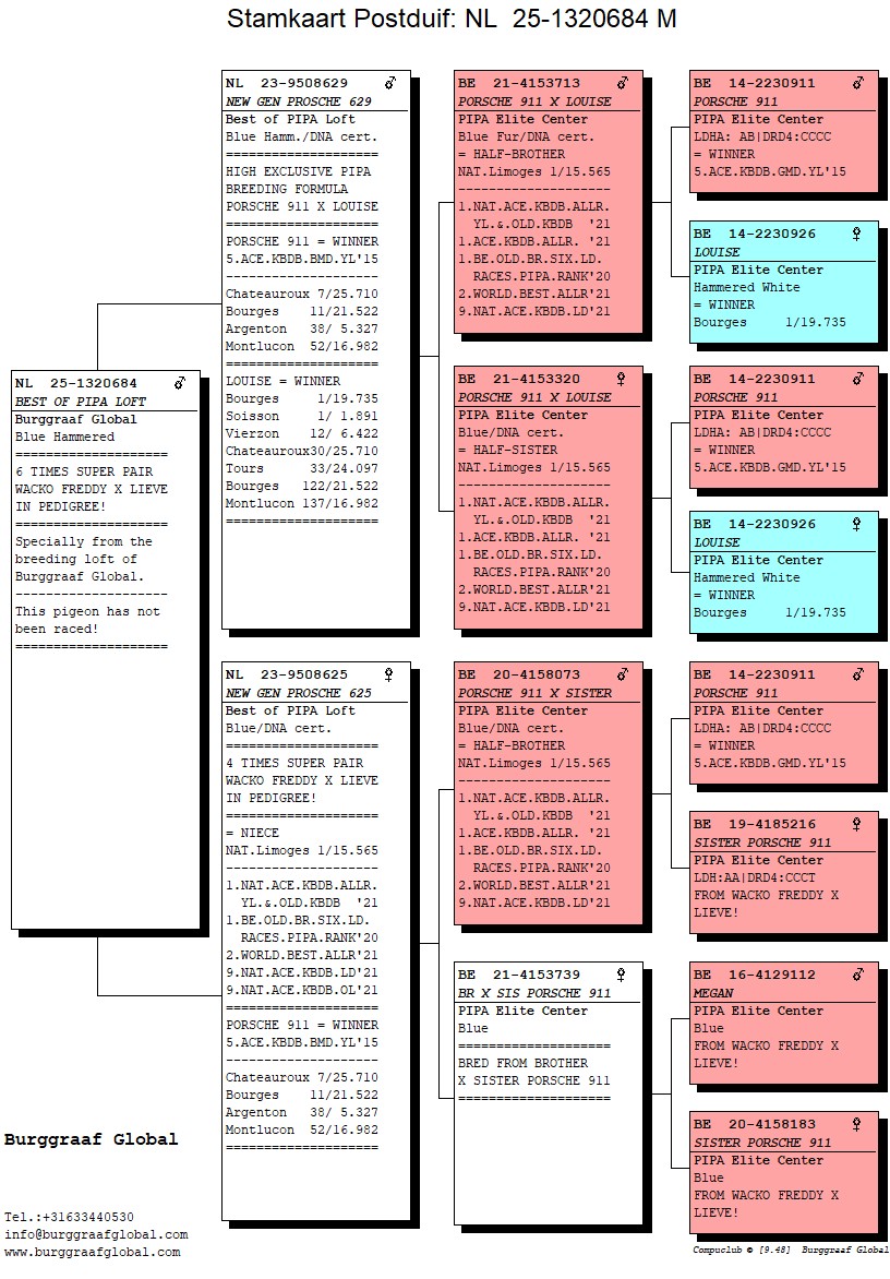 Een kweekparel met ongeëvenaarde genetica uit de beste PIPA-lijnen (Porsche 911 x Louise). Met meervoudige nationale asduiven en absolute winnaars in de lijn is NL25-1320684 een investering in de toekomst.