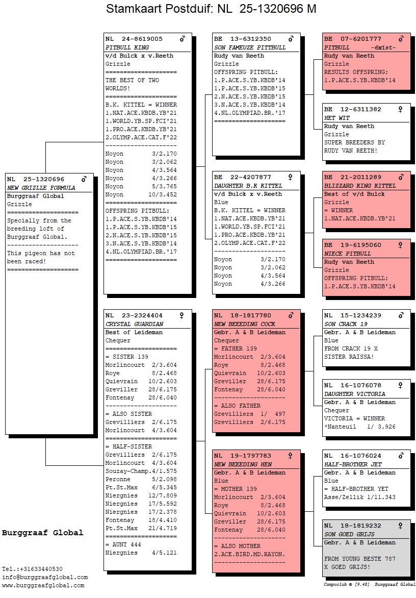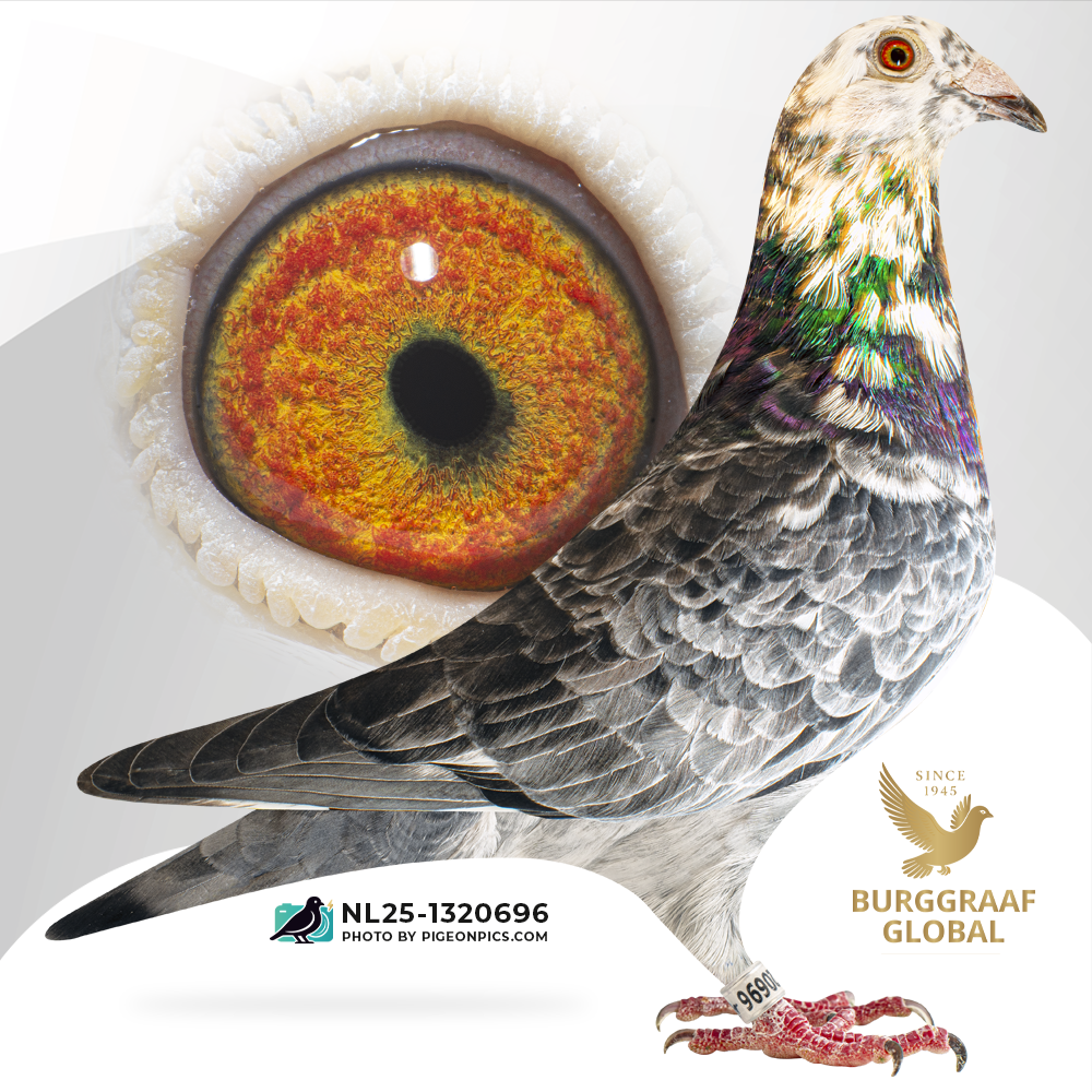 Deze jonge Grizzle-doffer komt rechtstreeks uit de topkweek van Burggraaf Global. Met bewezen lijnen van Pitbull King (v/d Bulck x v. Reeth) en de sterke Leideman-familie via Crystal Guardian, is dit een duif met uitzonderlijk genetisch fundament.