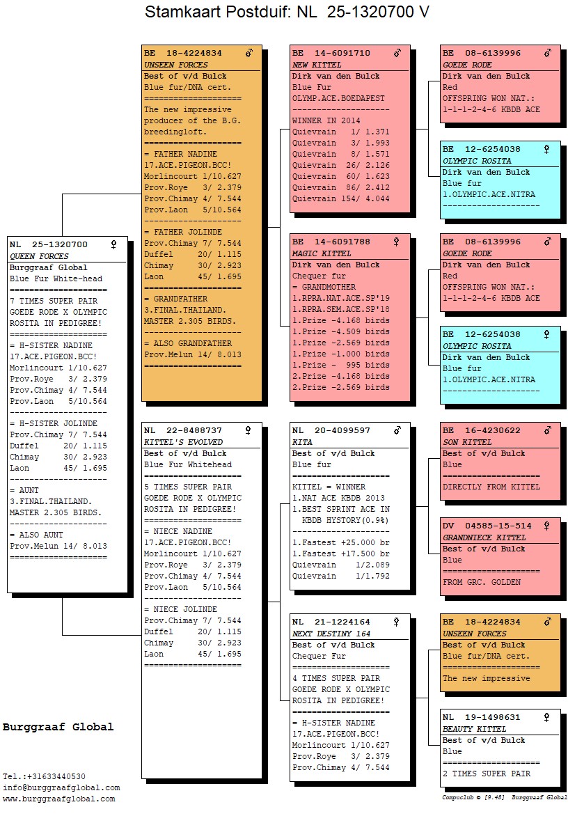 Queen Forces is een elite-duivin uit de meest succesvolle Bulck-lijn ooit: Goede Rode x Olympic Rosita. Met 7x deze superkoppeling in de pedigree is ze een genetisch juweel, ideaal voor de moderne kweekbasis.