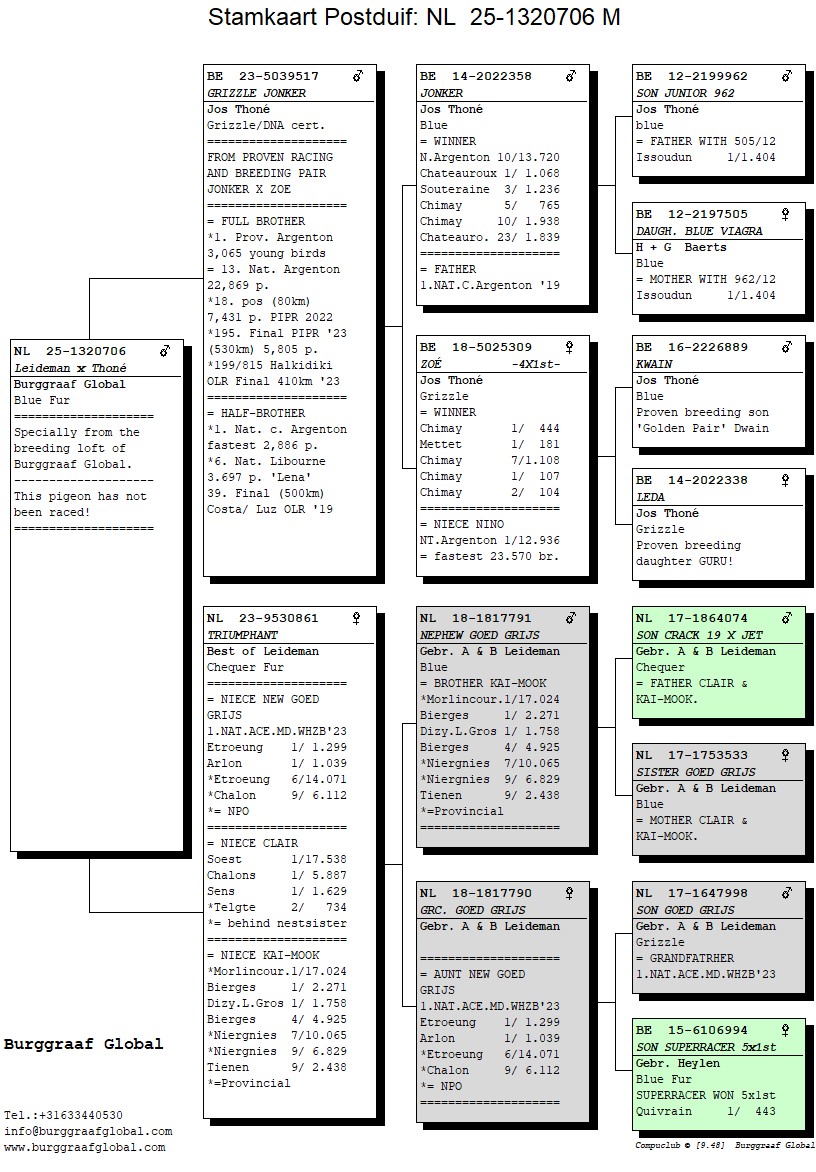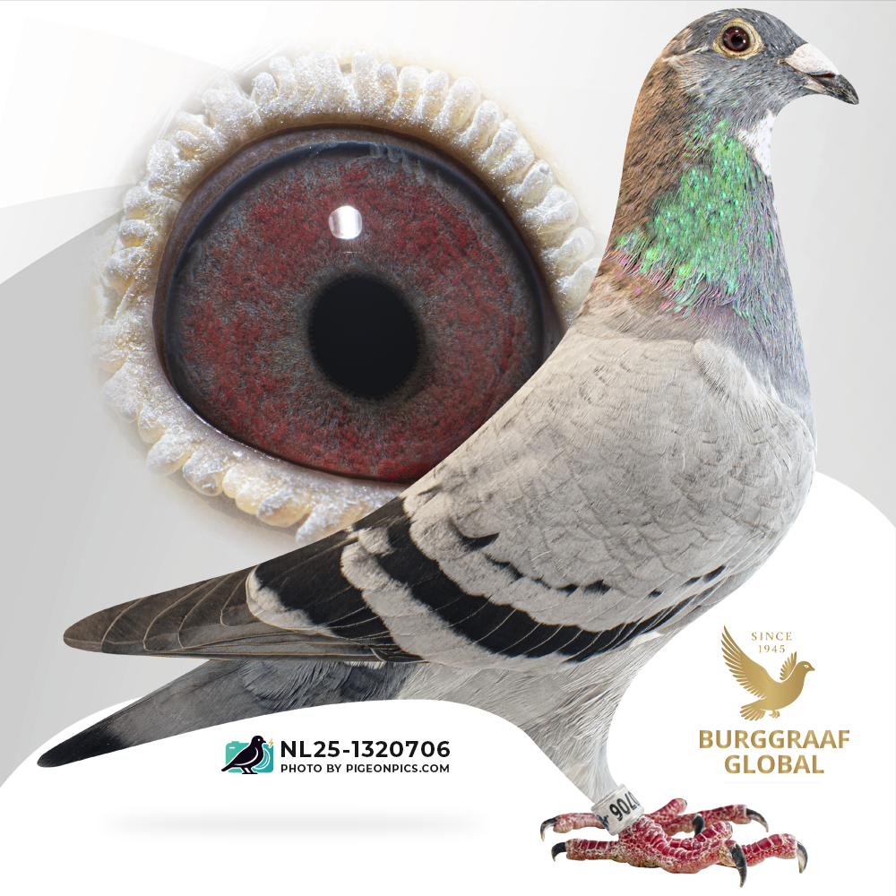 Fokker: Burggraaf Global Een unieke combinatie van Gebr. Leideman en Jos Thoné, met als rode draad Goed Grijs, Jonker en Zoé — goed voor vier eerste prijzen. Een onbevlogen doffer uit Grizzle Jonker x Triumphant, ideaal voor de moderne kweekbasis.